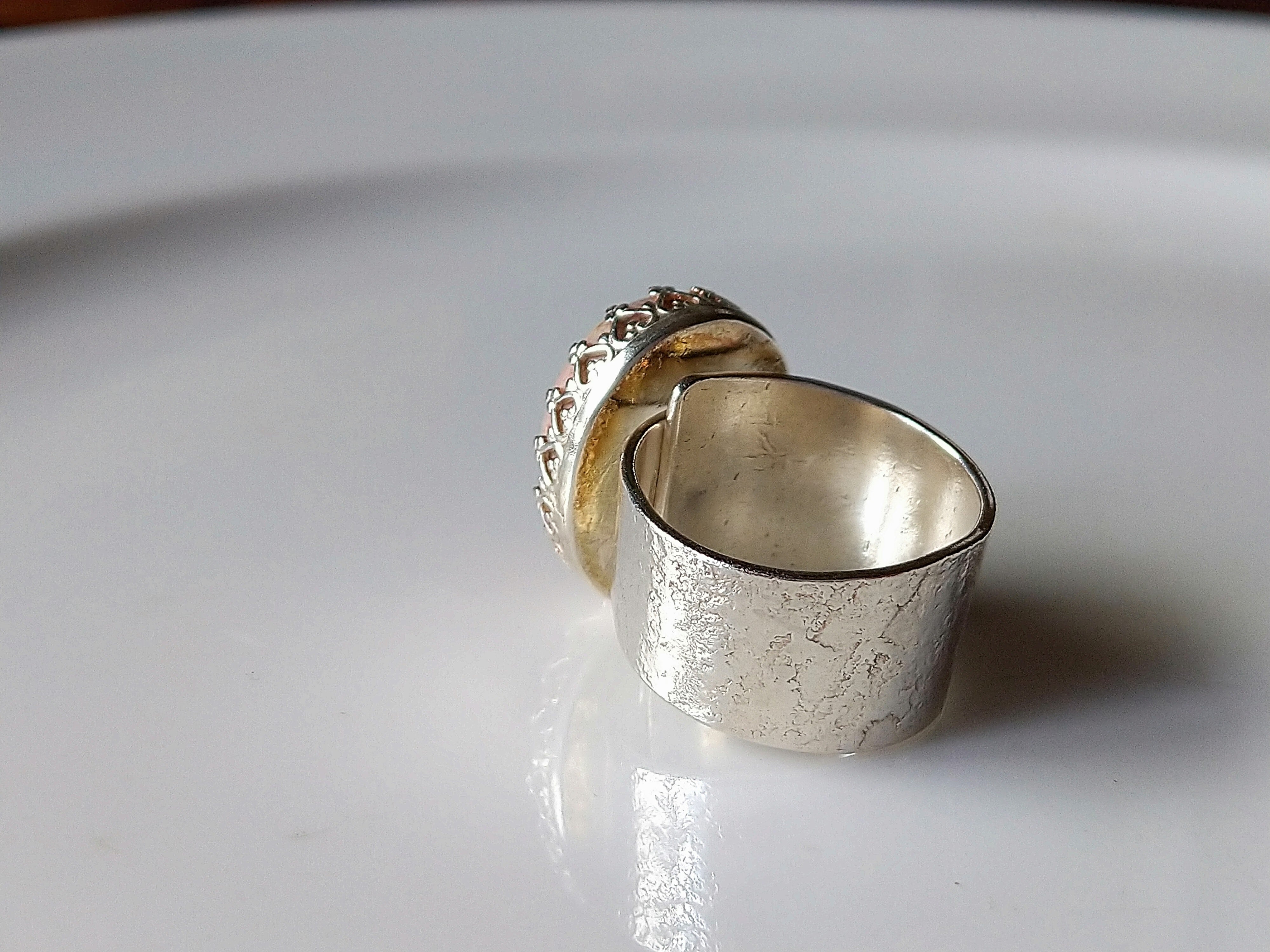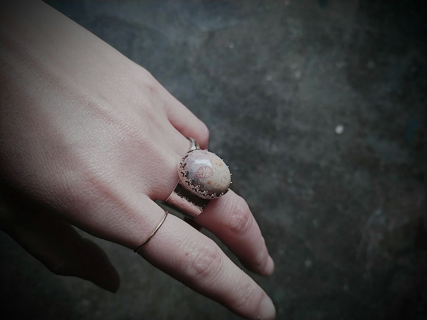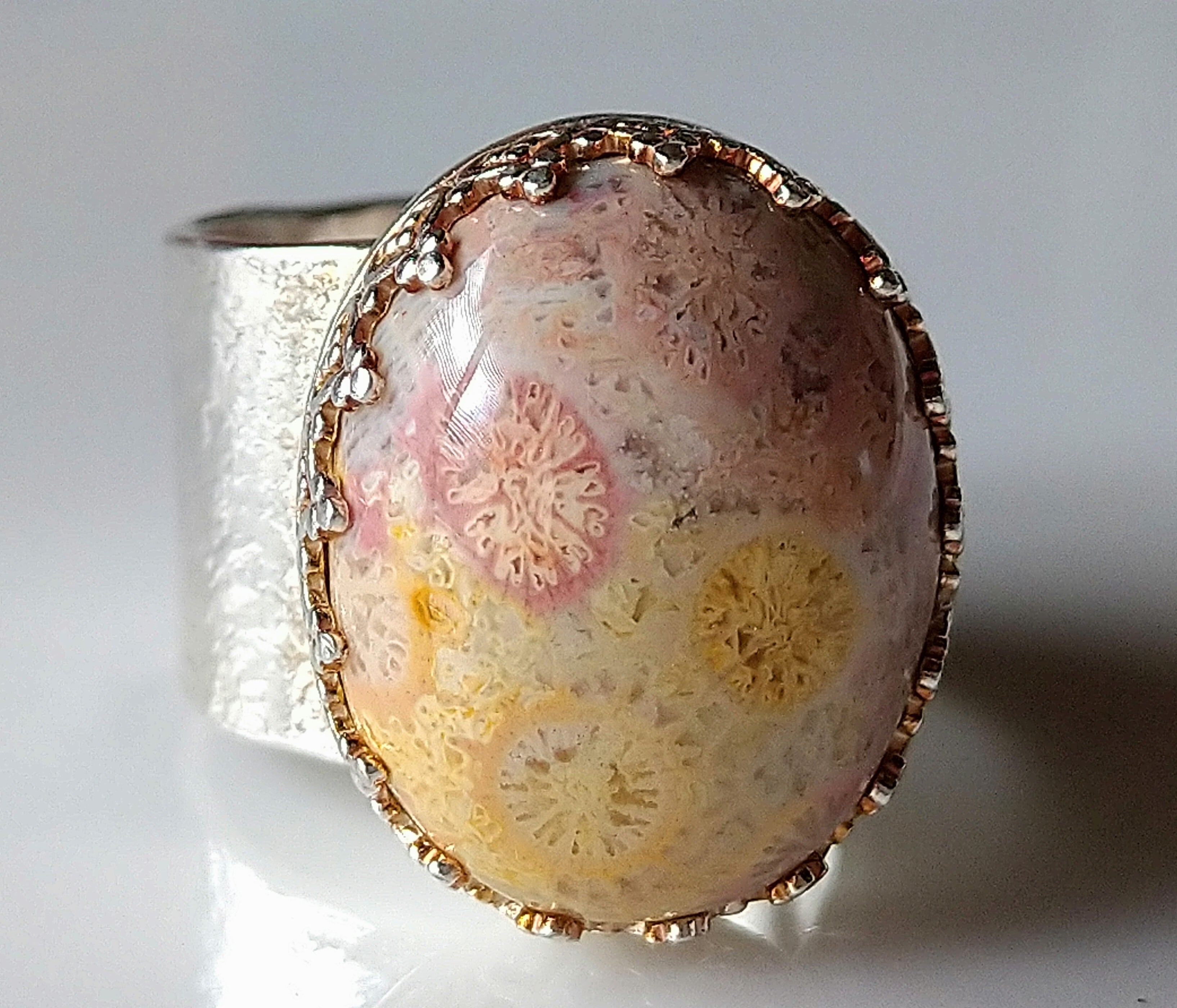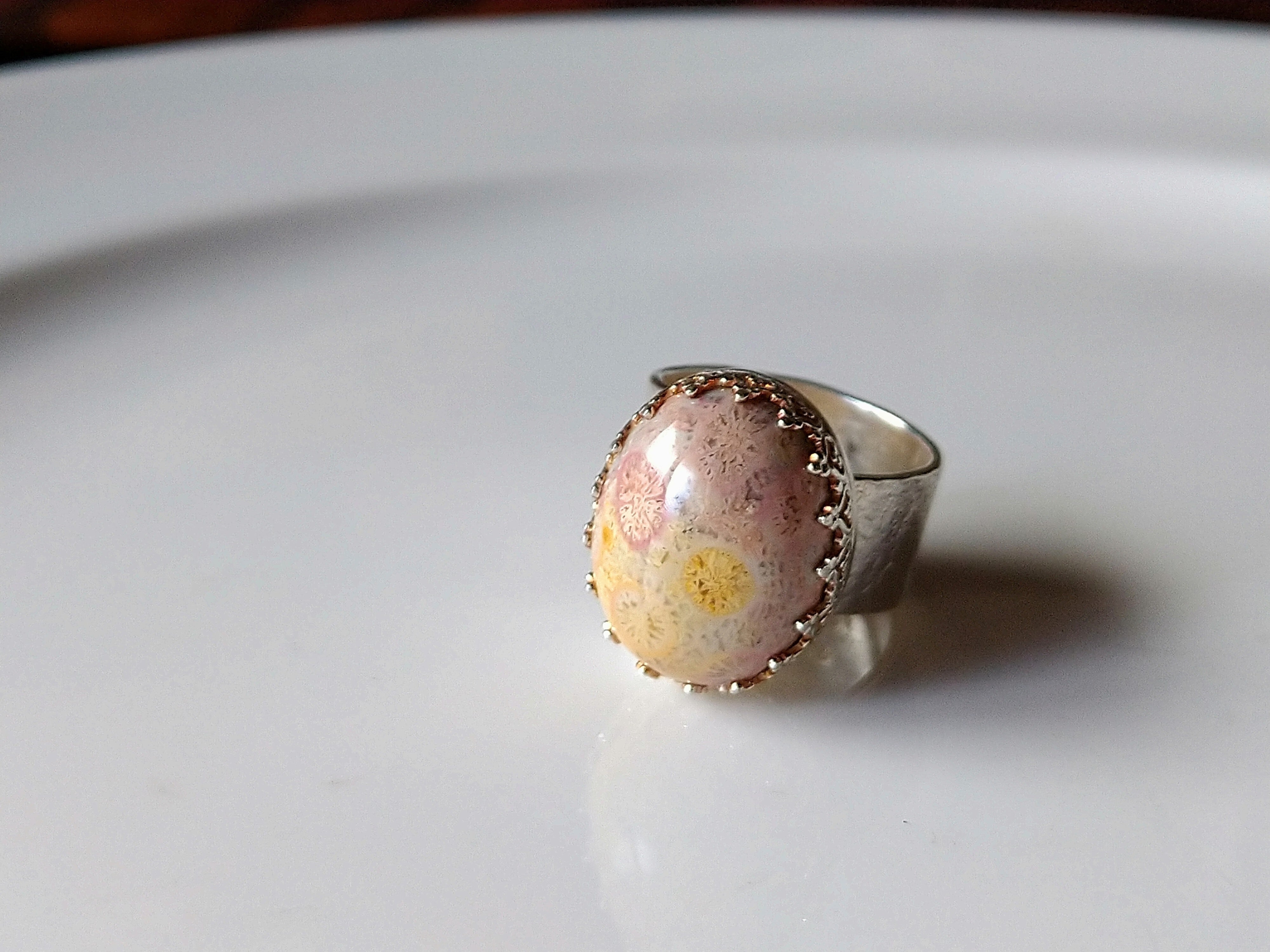淡い桃色の珊瑚の化石をシルバーリングにしました